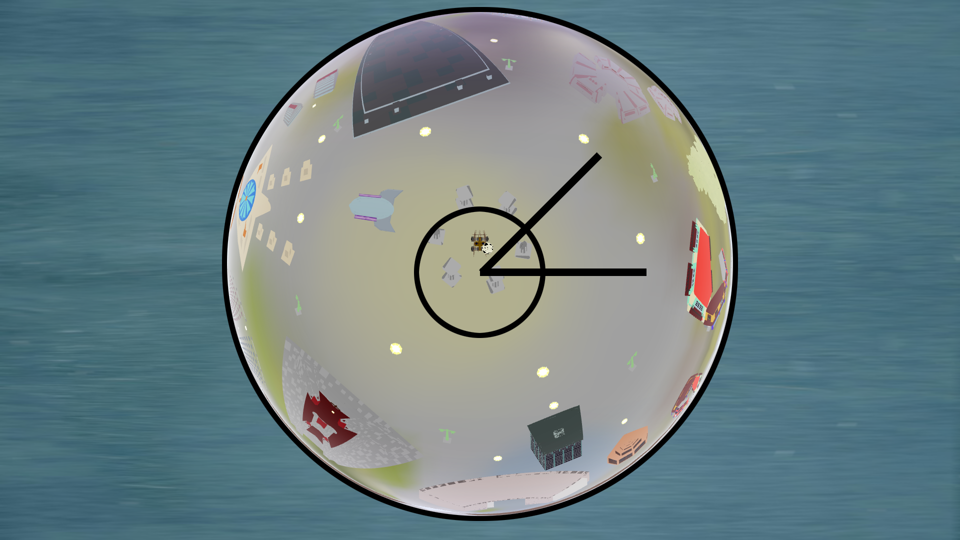 But it was a bit dull. Even though it was a curved space and everything in it was kept inside a sphere, Klein's sphere, we thought we could not really appreciate what was going on. So we froze the world and flew away to see it from another point. We developed the euclidean camera, we kept the hyperbolic camera in place, but we could see everything from somewhere else.